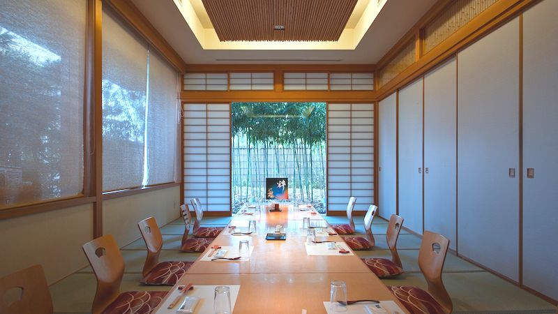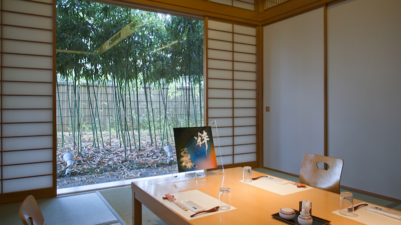 間接照明のシェードや欄間には竹があしらわれ、やさしく癒される空間。